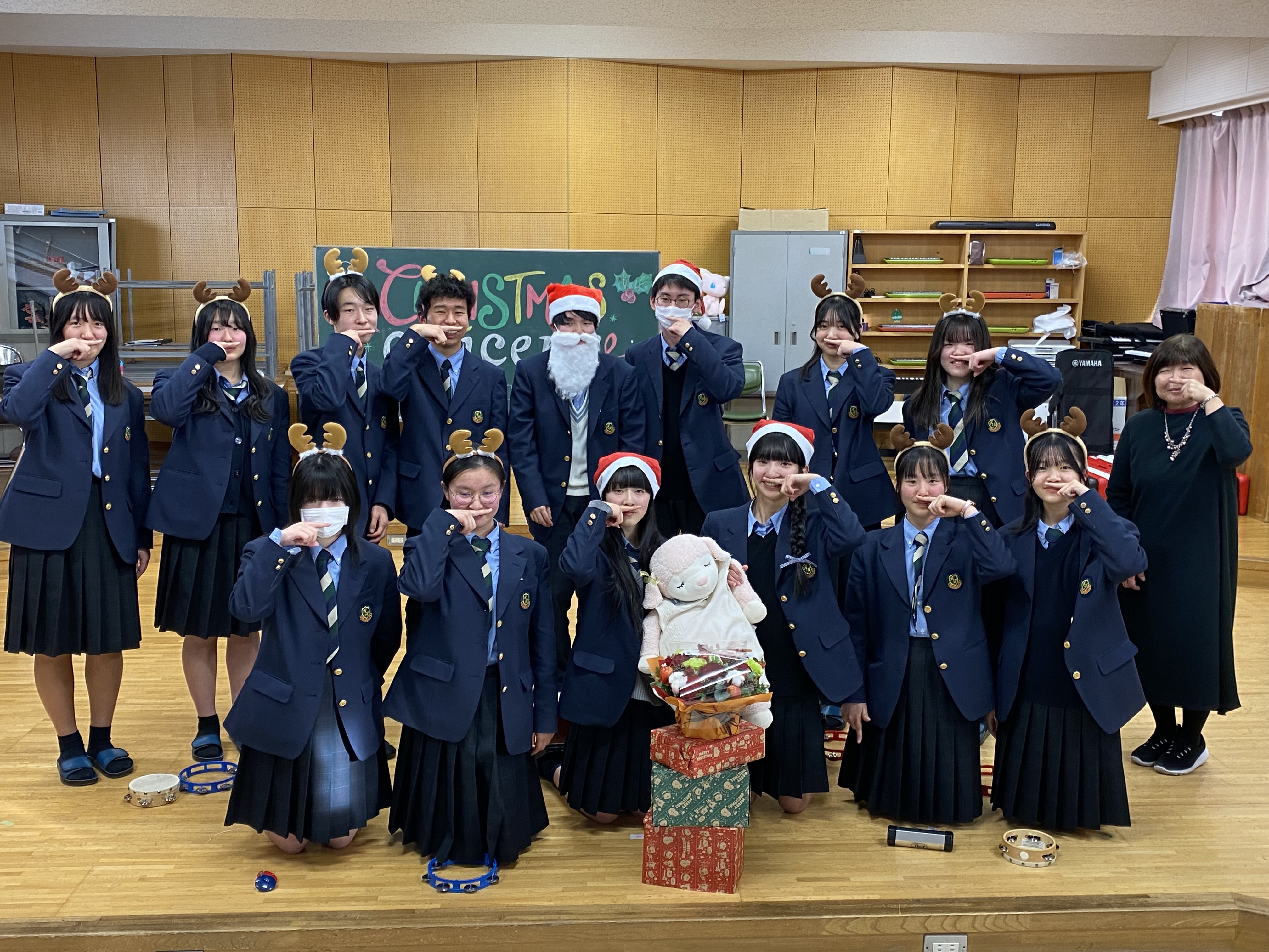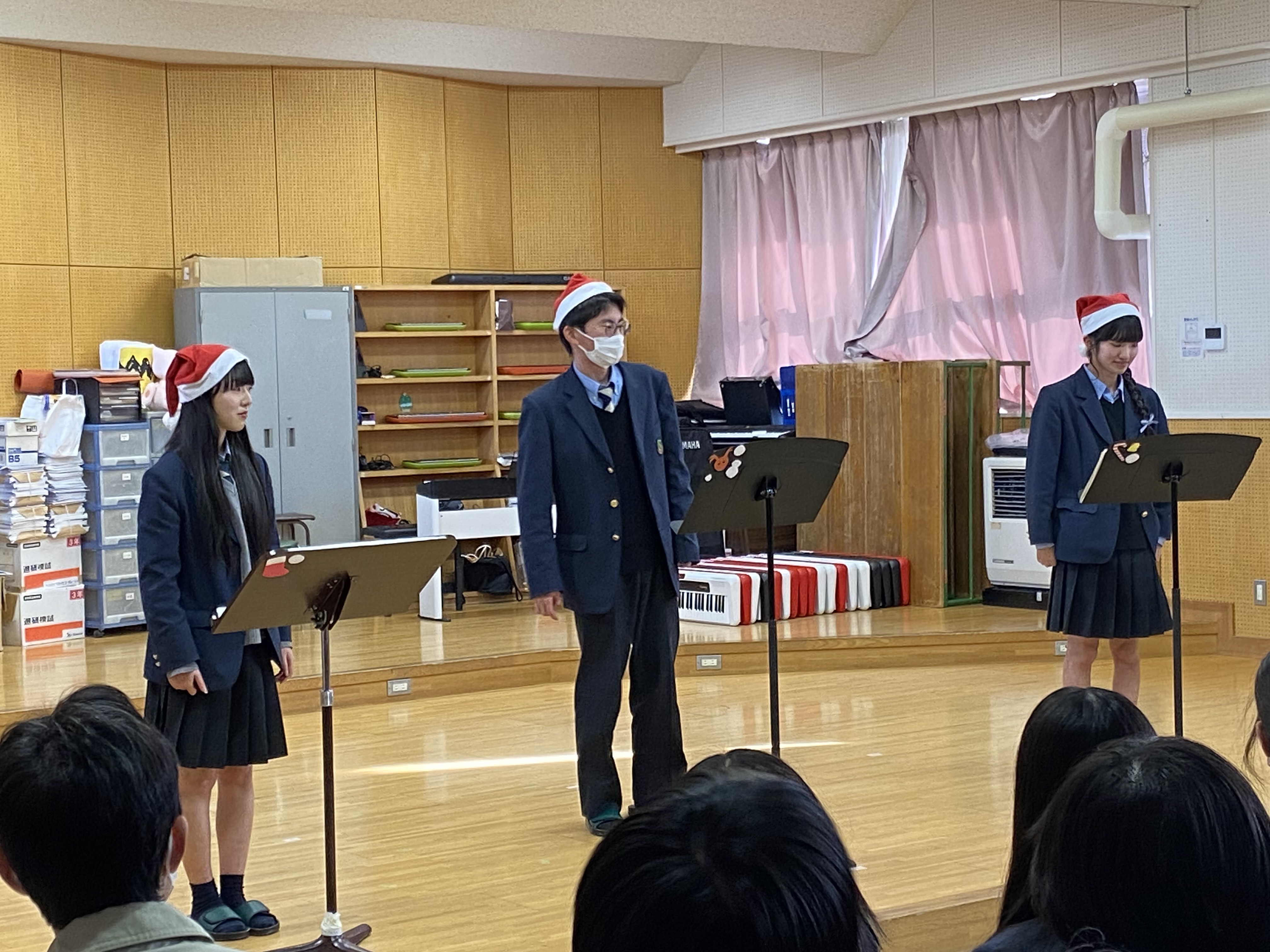 課外を終えた午後、音楽室にはたくさんの生徒の皆さんと先生方に足を運んでいただき、とても温かな雰囲気で楽しいひとときを過ごすことができました。学年別の楽曲披露もあり、様々な形でクリスマスソングを堪能していただけたのではないでしょうか。